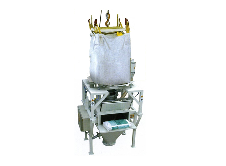 噸包拆包機,噸袋卸料機將噸袋包裝物料提升到進料口,人工將包裝袋下料口拆開后,打開流量控制閥和帶附帶的振動下料裝置促使包裝袋內(nèi)的粉粒狀物料通過自重落到下方料斗中。